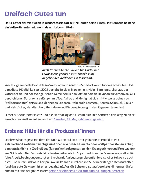 Alsdorfer Weltladen feiert 20-jähriges Bestehen