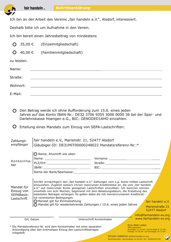 Vielen Dank für Ihr Interesse an einer Mitgliedschaft im Verein fair handeln e.V.. Wir freuen uns, dass Sie uns unterstützen wollen.